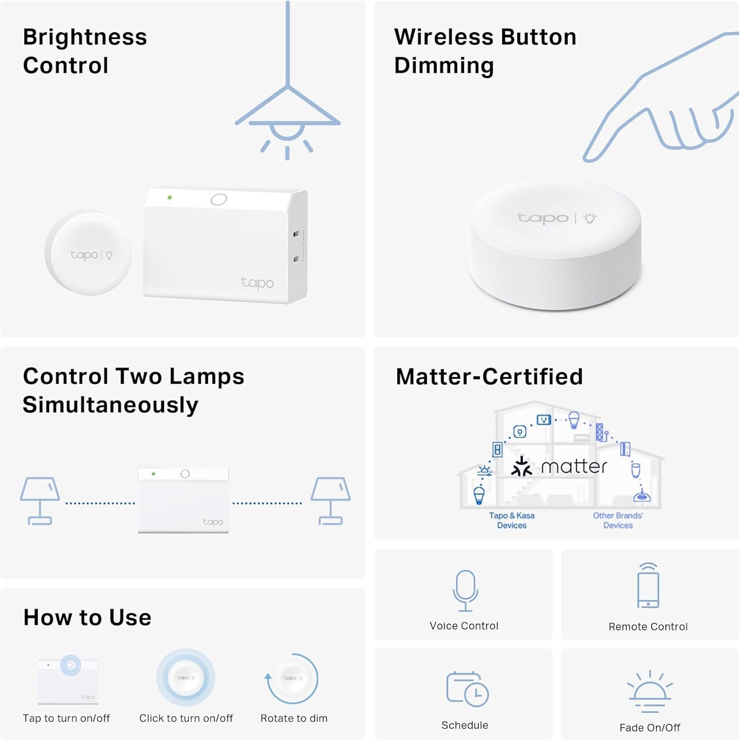 Upgrade your home lighting with the TP-Link Tapo Smart Dimmer Plug KIT from the Tapo Store, featuring Matter compatibility for seamless integration with Apple Home, Alexa, Google Home, and more. Effortlessly control two lamps at once using the wireless dimmer button or voice commands, and set the perfect ambience with smooth dimming and fade functions. With dual outlets, app control, and ETL certification, this versatile smart plug offers convenience, safety, and smart home connectivity—no hub required. Experience next-level lighting automation that adapts to your lifestyle.