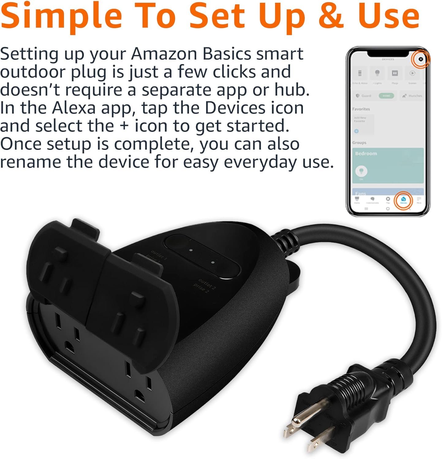 Upgrade your outdoor lighting and devices with the Amazon Basics Outdoor Smart Plug, featuring two individually controlled outlets for maximum flexibility. Effortlessly manage your electronics from anywhere using Alexa voice commands—no additional hub required. With weather-resistant IP65 protection and simple setup via the Alexa app, this smart plug delivers convenience, automation, and durability in one affordable package. Make your outdoor space smarter and more efficient with Amazon Basics.