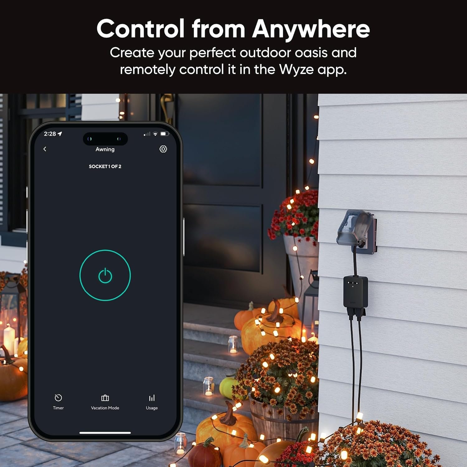 The Wyze Plug Outdoor from WYZE is a smart, dual-outlet plug designed for easy outdoor use with weather-resistant IP64 protection. Effortlessly control each outlet independently via the Wyze app or voice assistants like Alexa and Google, and monitor your energy usage with detailed insights and consumption alerts. Its impressive 300-foot WiFi range means you can manage devices from almost anywhere in your yard—no hub required. Perfect for streamlining your outdoor setup, this plug makes managing garden lights, decorations, or appliances simple and energy efficient.